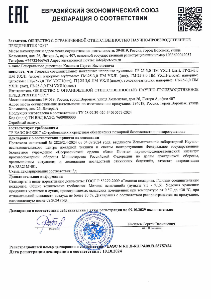 Муфтовая пожарная соединительная головка ГМ-25 (3,0) лат из латунного сплава выпускается по ТУ 28,99,39-020-34030573-2024.
